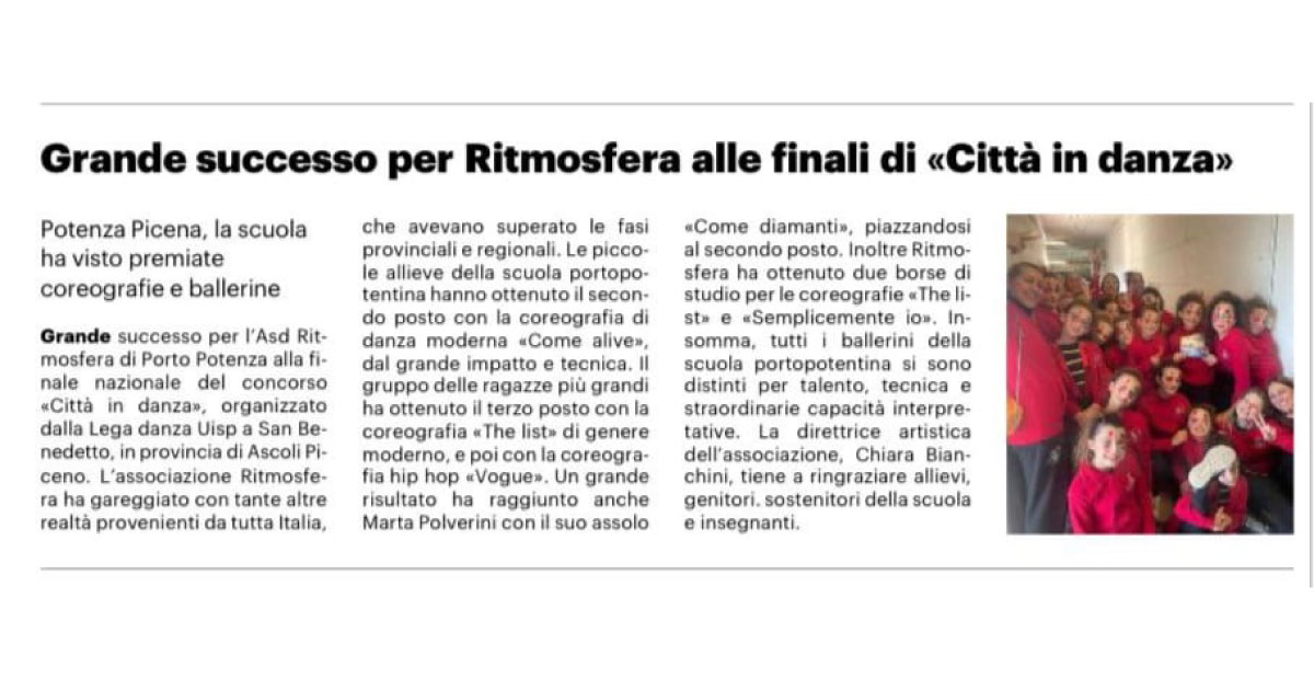 Potenza Picena, la scuola ha visto premiate coreografie e ballerine Grande successo per l’Asd Rit-mosfera di Porto Potenza alla fi-nale nazionale del concorso «Città in danza», organizzato dalla Lega danza Uisp a San Benedetto, in provincia di Ascoli Piceno. L’associazione Ritmosfera ha gareggiato con tante altre realtà provenienti da tutta